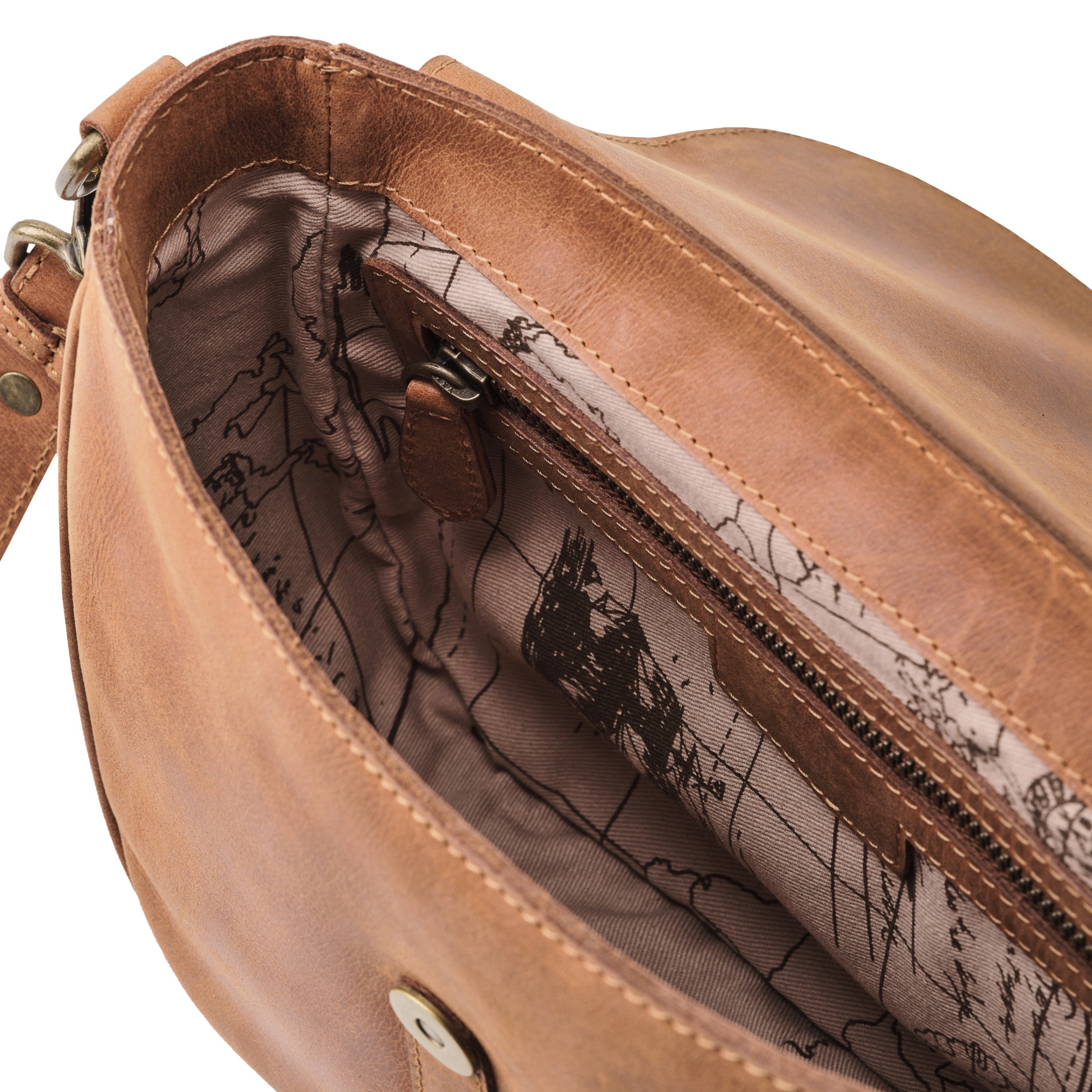 Notre tissu de doublure est en sergé pur coton, une matière douce et naturelle. Pour la collection Outlaw, nous avons créé un imprimé signature inspirant avec des cartes marines vintage qui ajoute une touche spéciale à chaque pièce. Cette doublure en coton de haute qualité offre non seulement du confort mais aussi un ajout élégant à nos sacs faits à la main.