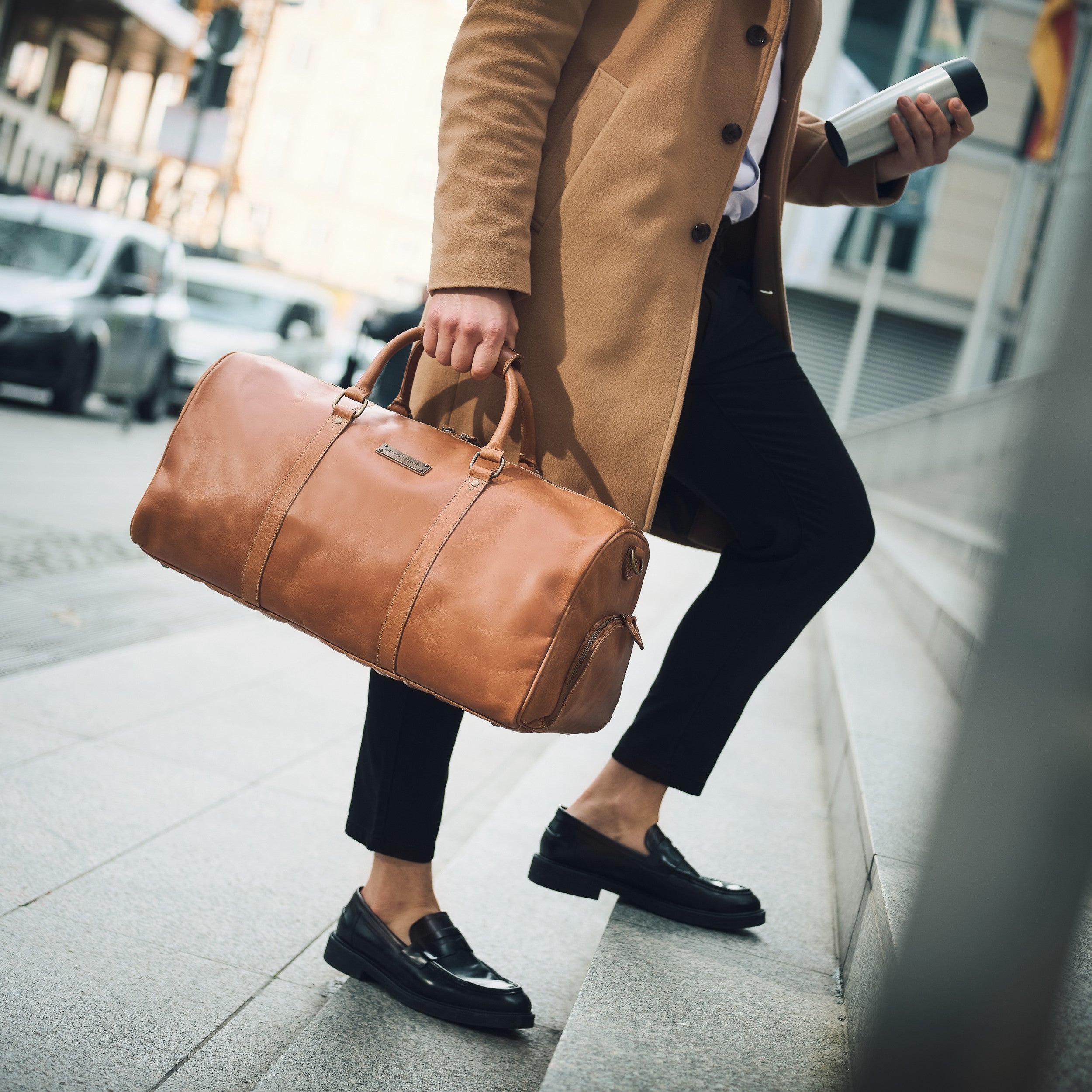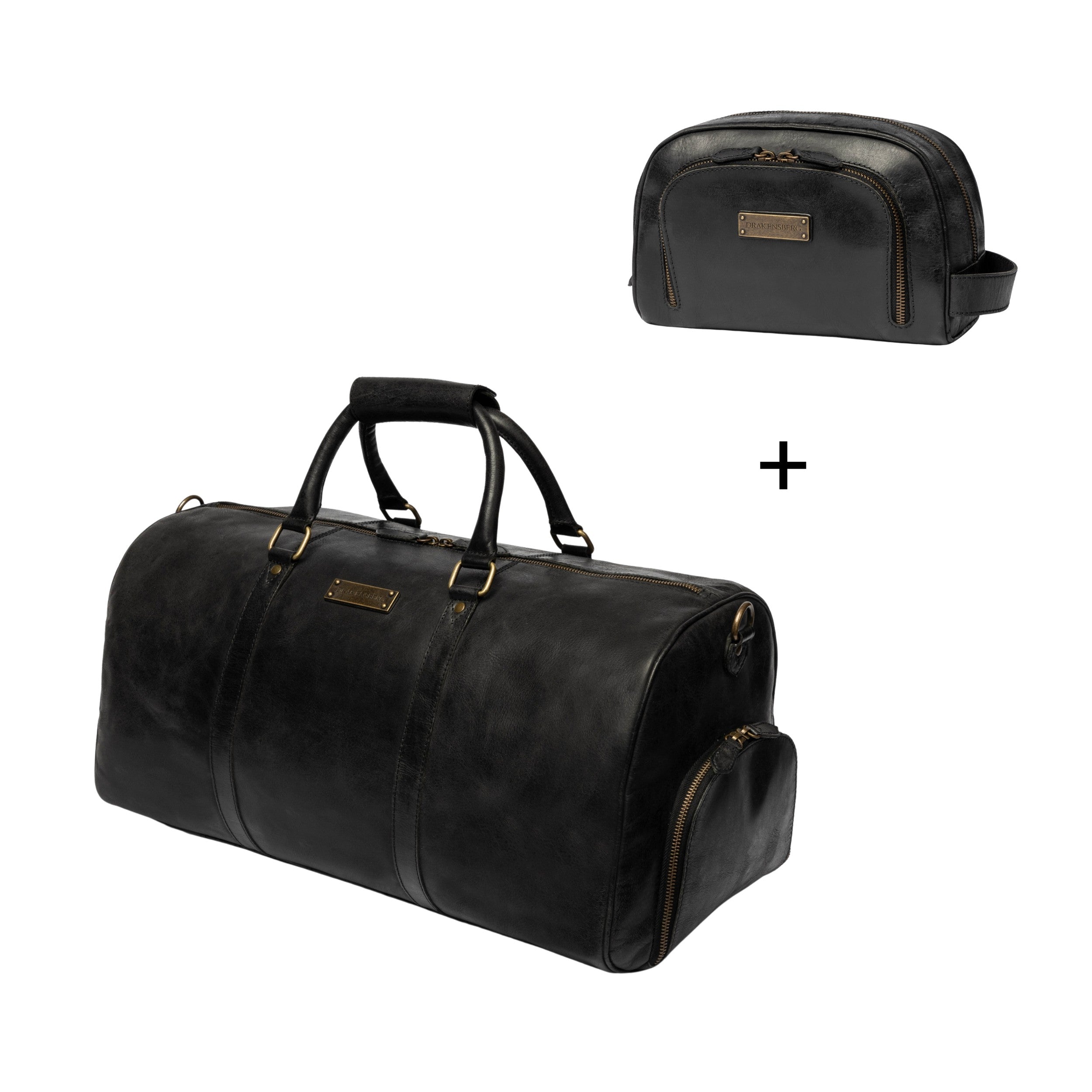 L'ensemble en deux pièces en cuir de haute qualité comprend le sac de voyage compact « Finn » et la trousse de toilette classique « Ben ». »Finn« est un sac de week-end pratique avec un compartiment à chaussures intégré et est idéal comme bagage à main, accepté par la plupart des compagnies aériennes. Le compartiment principal s'ouvre facilement grâce à une fermeture éclair et il y a une poche supplémentaire zippée à l'intérieur pour les objets de valeur. Il y a un autre compartiment pratique à fermeture éclair à l'extérieur du dos. Le sac de voyage peut être porté de manière décontractée sur l'épaule ou élégamment à la main grâce aux lanières en cuir.