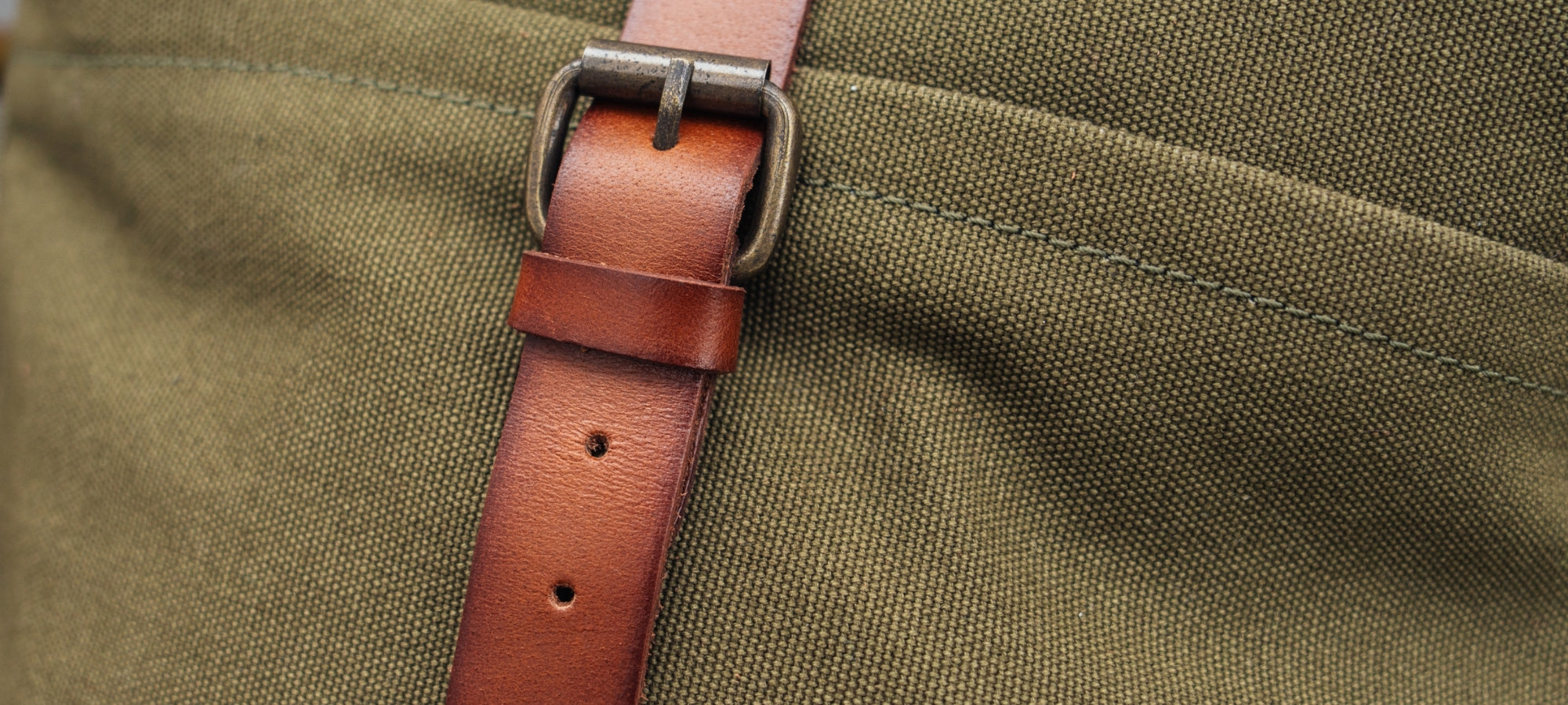 Material außen: 18oz Baumwoll-Canvas, imprägniert & Büffelleder (vegetabil gegerbt)